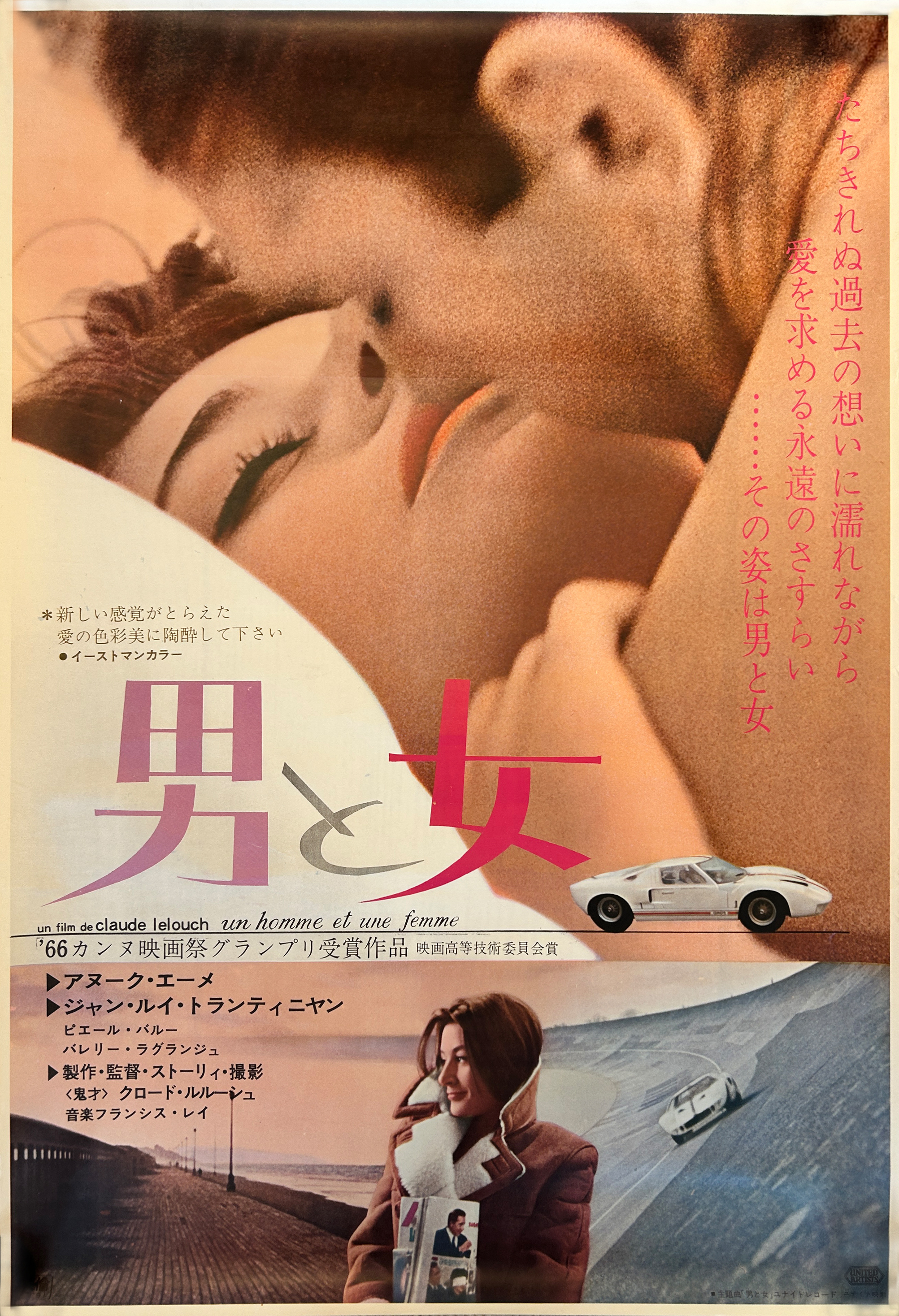 This is a Japanese B2 Poster (20.3" x 28.7") for the French 1966 romantic drama film "A Man and a Woman" (Un Homme et une Femme). Directed by Claude Lelouch, the film won the Grand Prix (now the Palme d'Or) at the 1966 Cannes Film Festival.