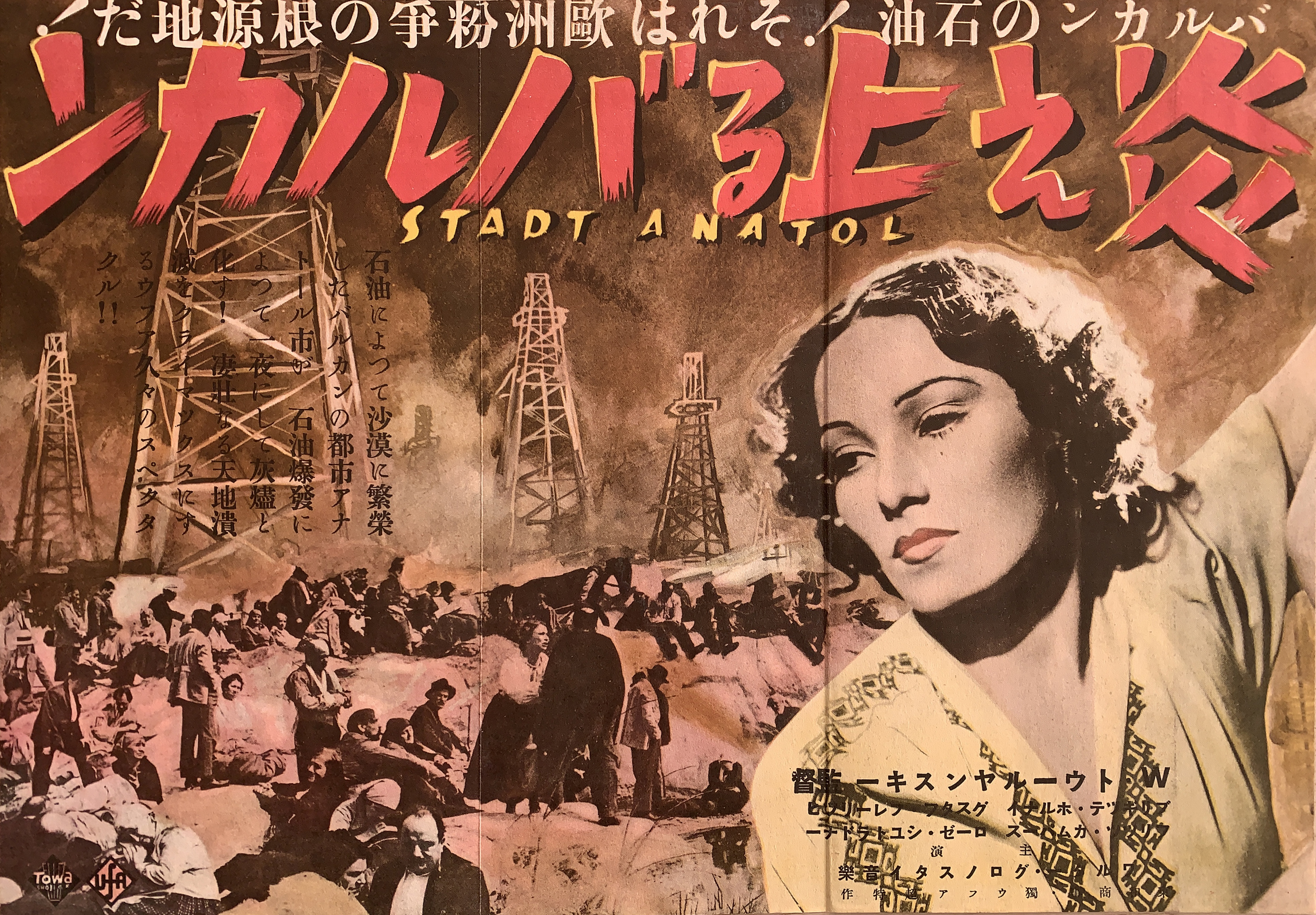 This is a Japanese B5 Chirashi Flyer (15" x 10.25" flat & 2-sided) for the 1936 German film, City of Anatol (German: Stadt Anatol). Directed by Viktor Tourjansky and starring Gustav Fröhlich, Brigitte Horney and Fritz Kampers, it is based on a 1932 novel City of Anatol by Bernhard Kellermann. The film is set in a small city in the Balkans, where the discovery of oil leads to a major boom.