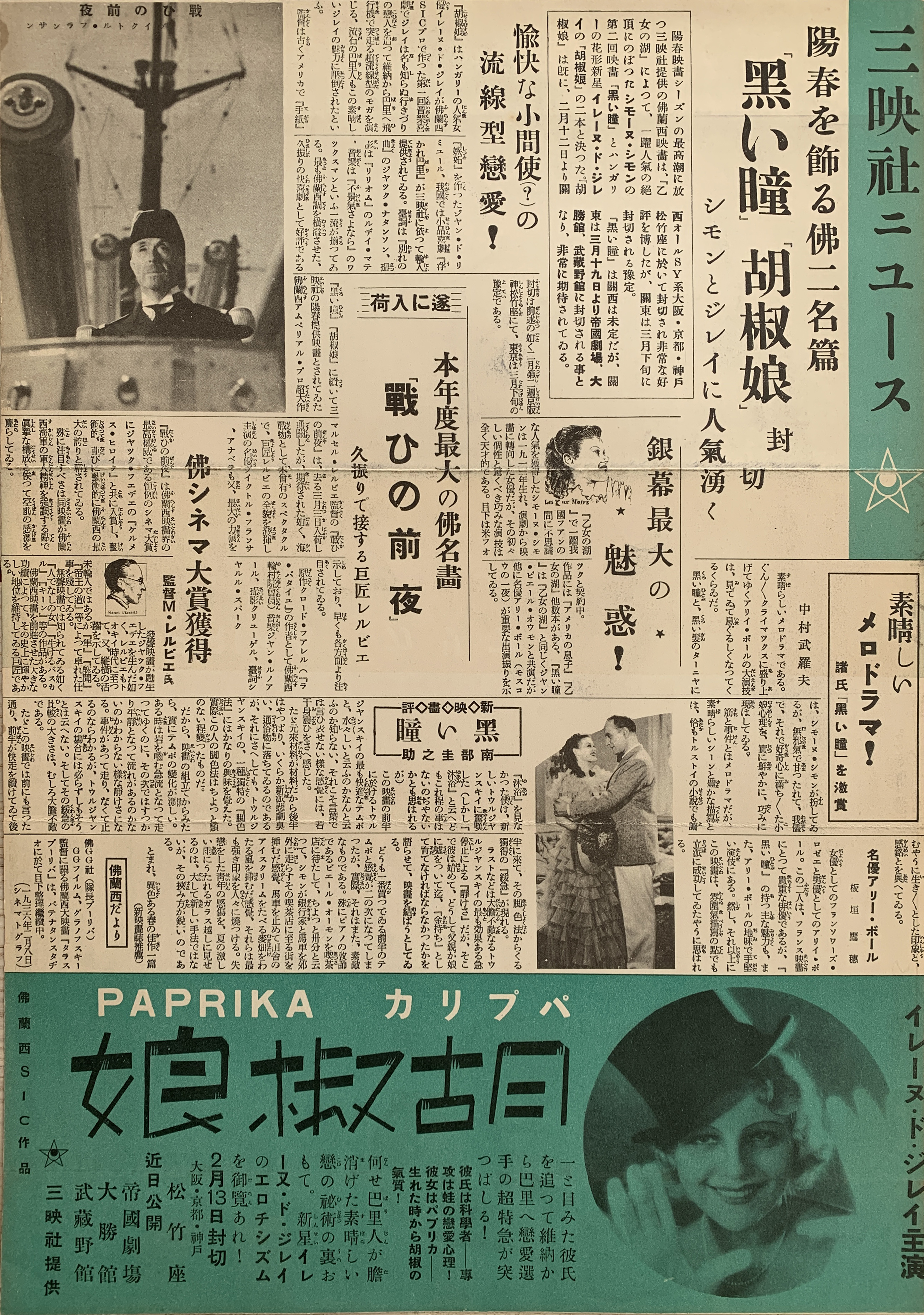 • Kuroi Hitomi (Black Eyes / 黒い瞳): A French film starring Simone Simon and Harry Baur. The brochure notes that following the success of Lac aux dames (乙女の湖), this second film starring Simon was highly anticipated and set to open in Tokyo theaters like the Imperial Theater and Musashinokan on March 19th.