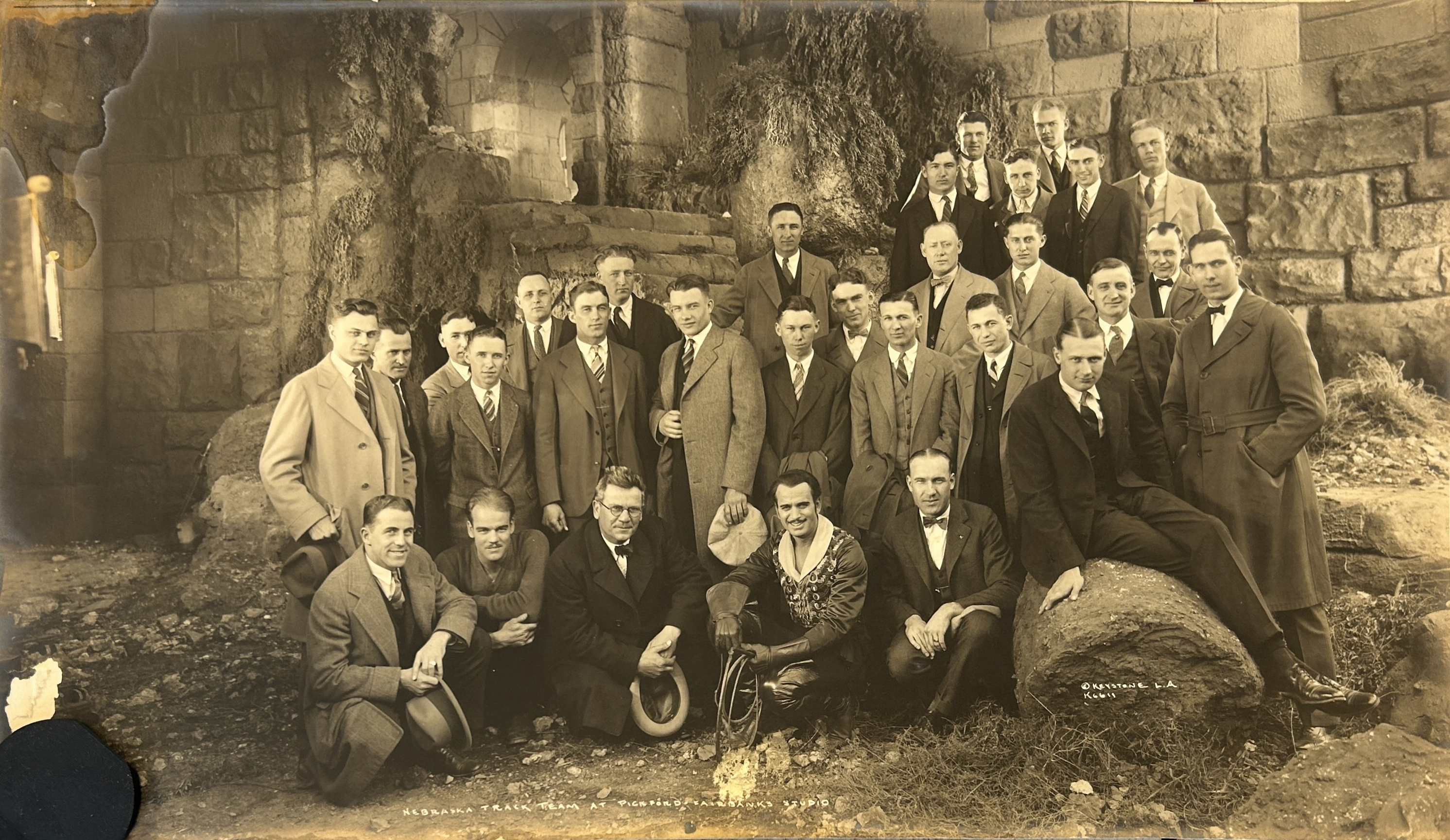 This is an original 20" x 11"photograph of the University of Nebraska Track Team during a visit to the Pickford-Fairbanks Studio in West Hollywood, California, in the 1920s.