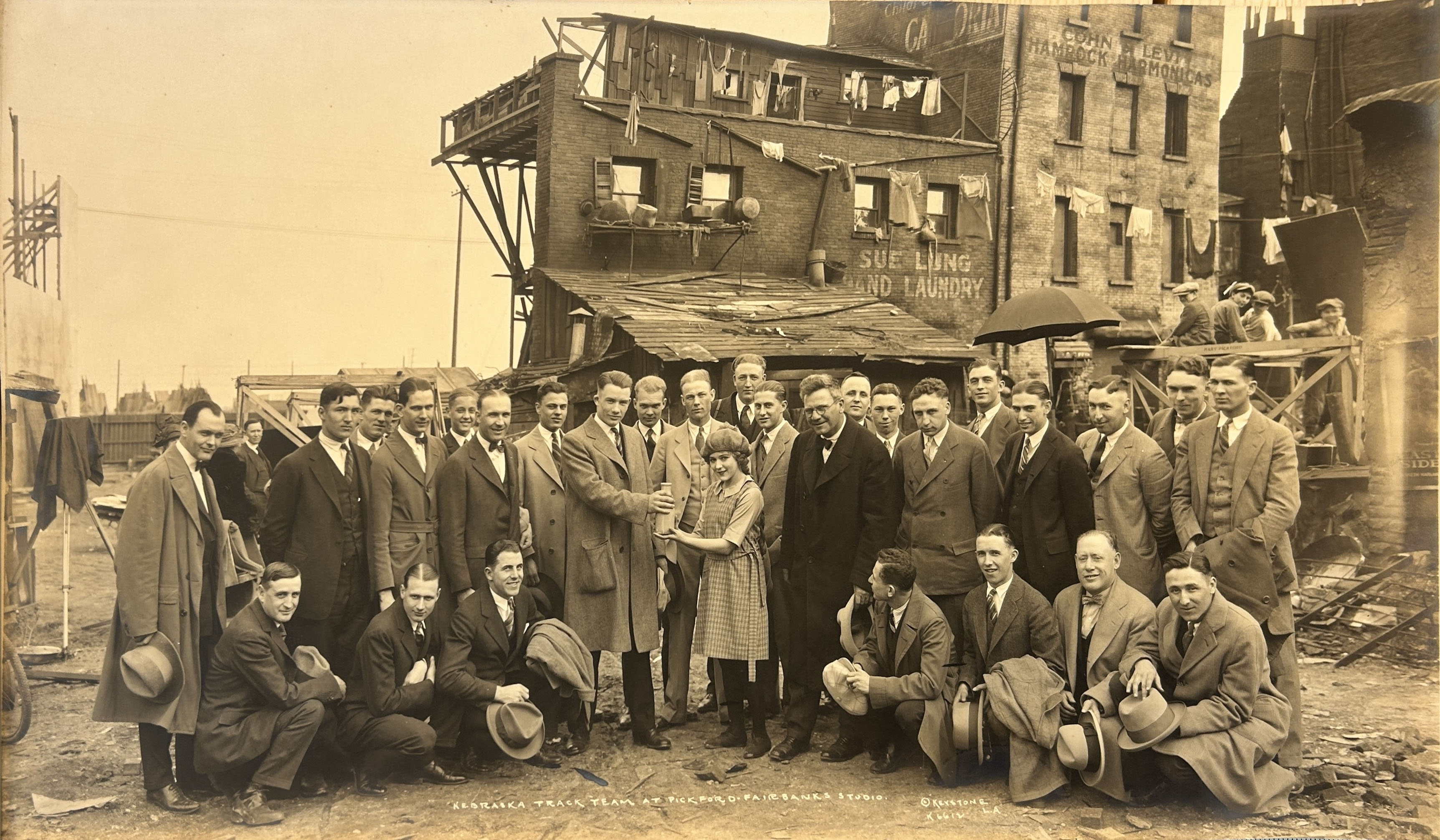 The image shows Members of the Nebraska Track Team posing with film star Mary Pickford, who is standing in the center. The scene is set at the Pickford-Fairbanks Studio, which was located at 1041 North Formosa Avenue in West Hollywood. The Pickford-Fairbanks Studio, was founded in 1919 by Fairbanks, Mary Pickford, Charlie Chaplin, and D.W. Griffith as part of United Artists. In the 1920s, it was common for prominent sports teams or traveling groups to visit major film studios, often meeting the era's biggest celebrities like Fairbanks and Pickford, who were considered Hollywood's first "power couple".