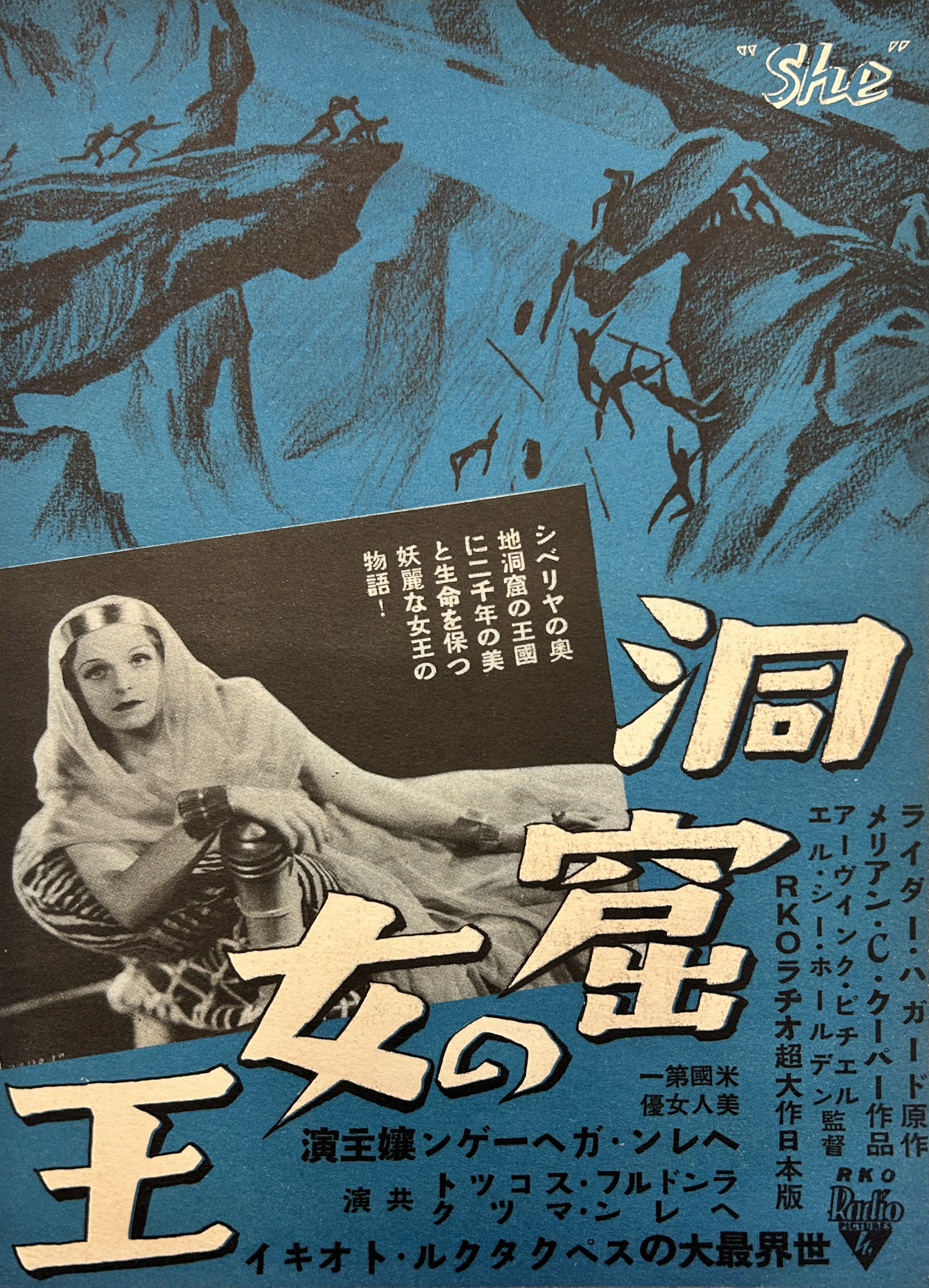 The flip side advertises the 1935 adventure-fantasy film She, a 1935 American adventure film produced by Merian C. Cooper. It is based on the 1887 novel of the same name by H. Rider Haggard. A man named Leo Vincey travels with his friend and the daughter of a guide to a mysterious place in Northern Siberia, where his ancestor reported finding the secret to immortality. They discover a lost world where a woman named She Who Must Be Obeyed - known as "She" - rules over an exotic civilization.