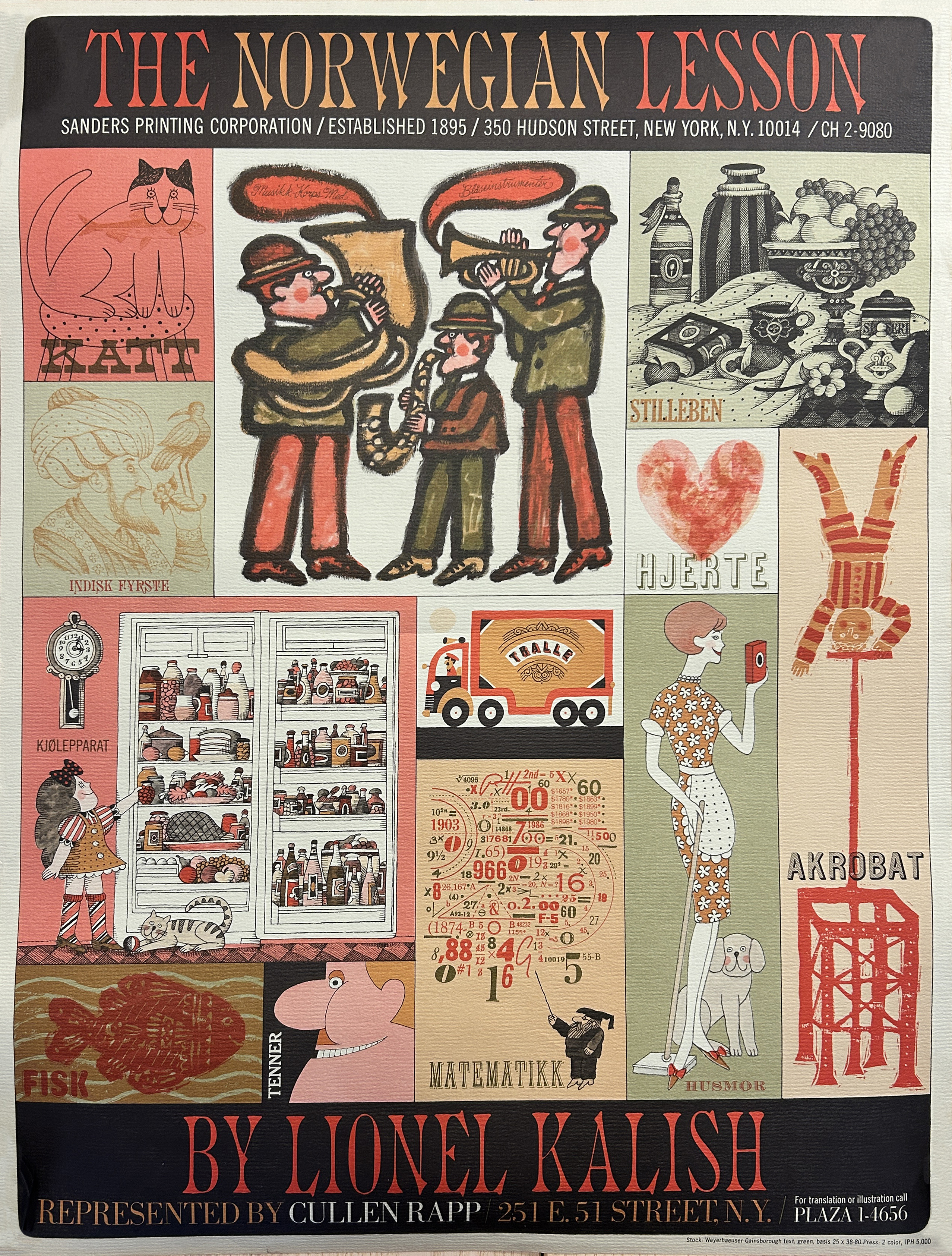 It is part of a celebrated series of promotional posters that Kalish designed to showcase the high-quality lithography of the Sanders Printing Corporation, then located at 350 Hudson Street in New York City.