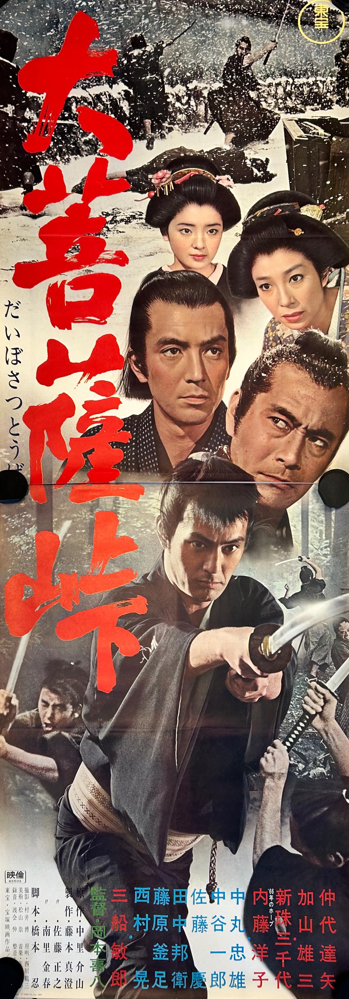 This is a Japanese STB Tatekan Poster (2-panels -20" x 58") for the 1966 Japanese samurai film, The Sword of Doom. known in Japan as Dai-bosatsu Tōge (大菩薩峠; "Great Bodhisattva Pass"), is a 1966 Japanese jidaigeki film. It is based on the serial novel of the same title by Kaizan Nakazato.