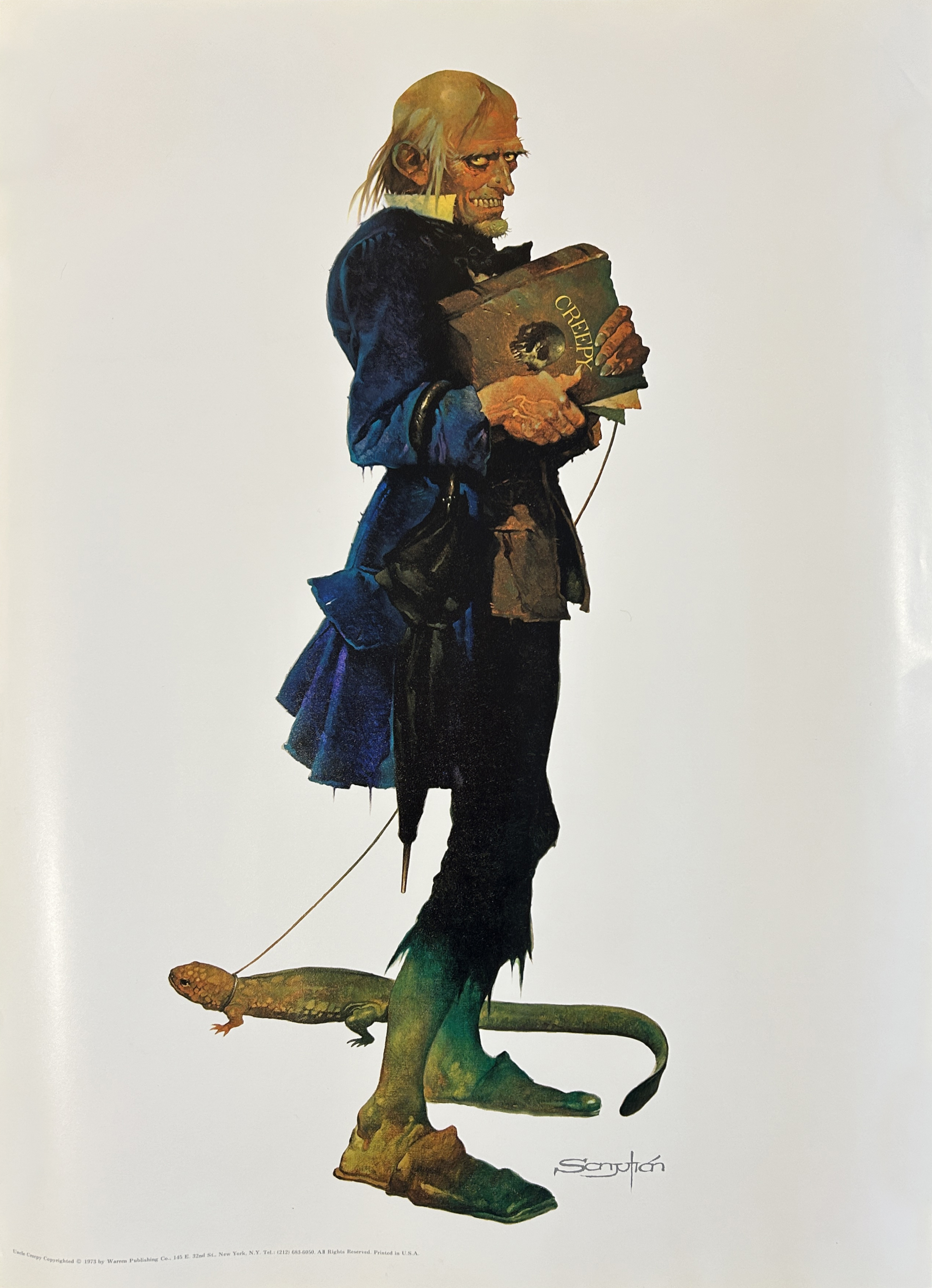 This is a 1973 poster (20" x 24") of Uncle Creepy, the iconic host of legendary, Creepy magazine. The artwork was created by the renowned Spanish artist Sanjulian (Manuel Sanjulián), who is famous for his detailed oil paintings and frequent work with Warren Publishing.