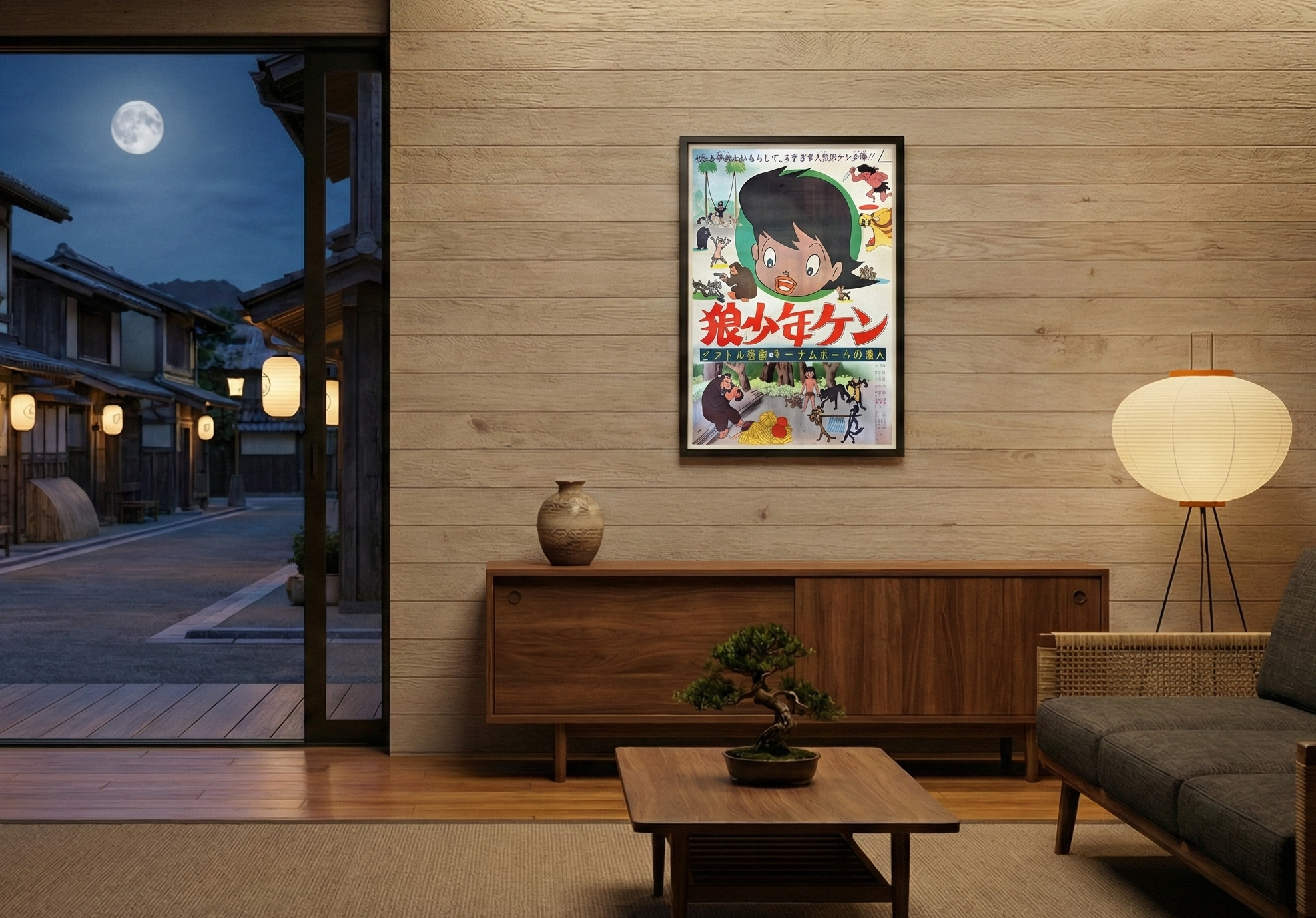 This is a 1964 Japanese B2 Poster (20.3" x 28.7") for the Japanese vintage anime series Wolf Boy Ken (Ōkami Shōnen Ken), which holds the distinction of being the first television anime series produced by Toei Animation (then known as Toei Doga).
